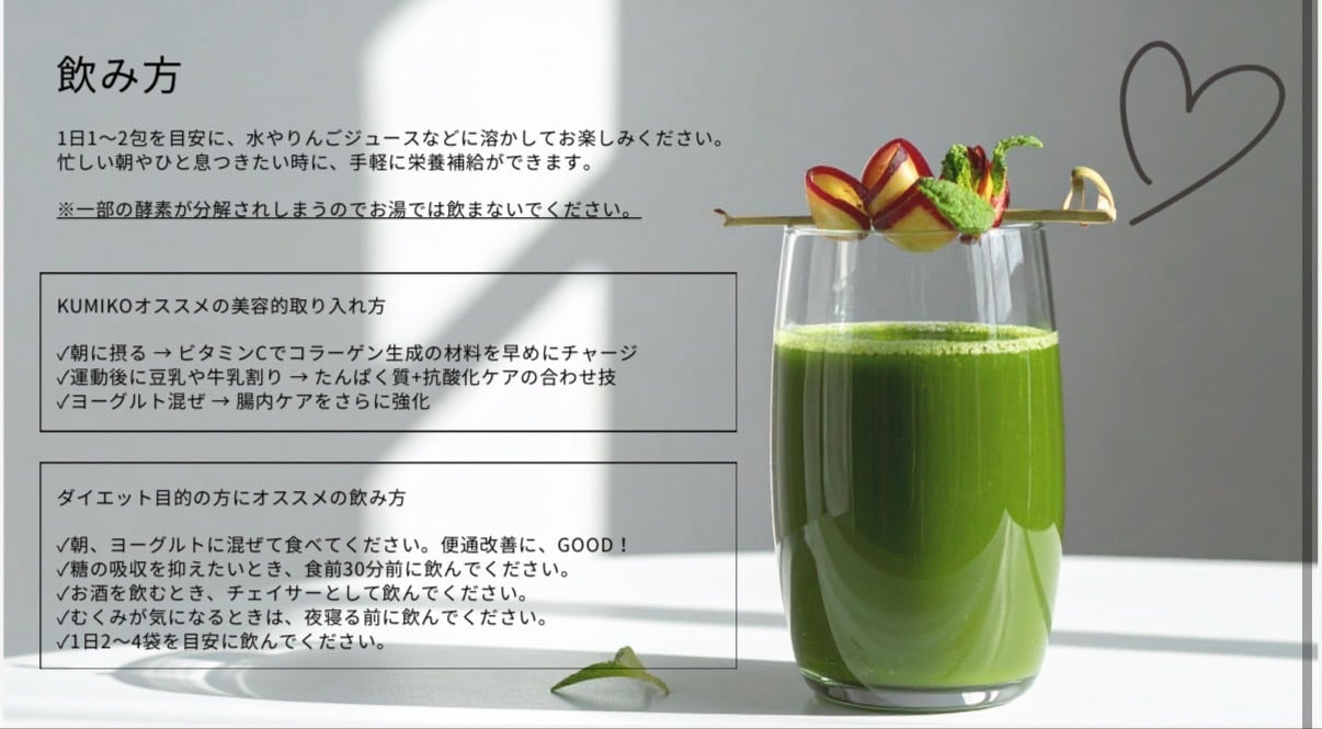 従来の「苦い・飲みにくい」青汁のイメージを覆し、毎日のルーティンが楽しみになるような、清々しい味わいをお届けします。